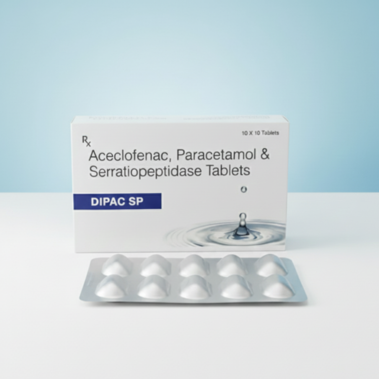 DIPAC SP Tablets contain a synergistic combination of Aceclofenac, Paracetamol, and Serratiopeptidase, designed to provide effective management of pain and inflammation while supporting faster recovery.