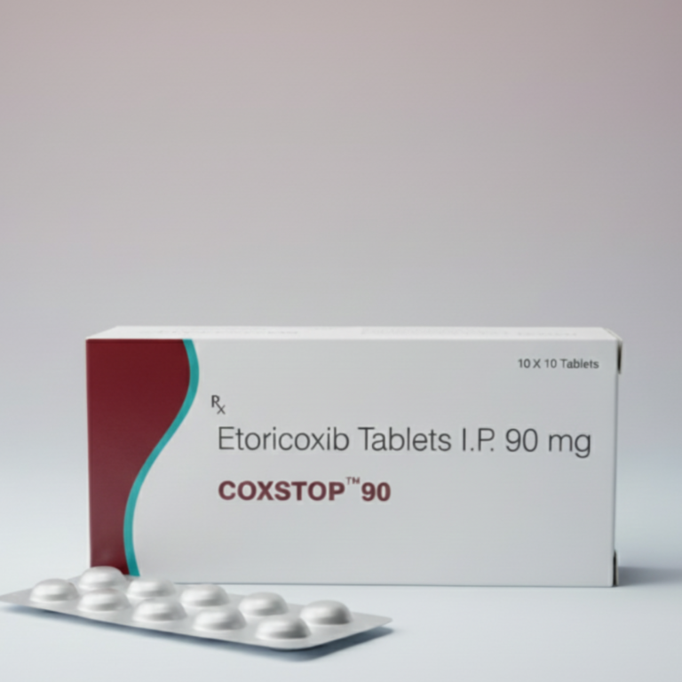 COXSTOP™ 90 Tablets contain Etoricoxib I.P. 90 mg, a selective COX-2 inhibitor known for its targeted anti-inflammatory and analgesic action with improved gastrointestinal tolerability compared to conventional NSAIDs.