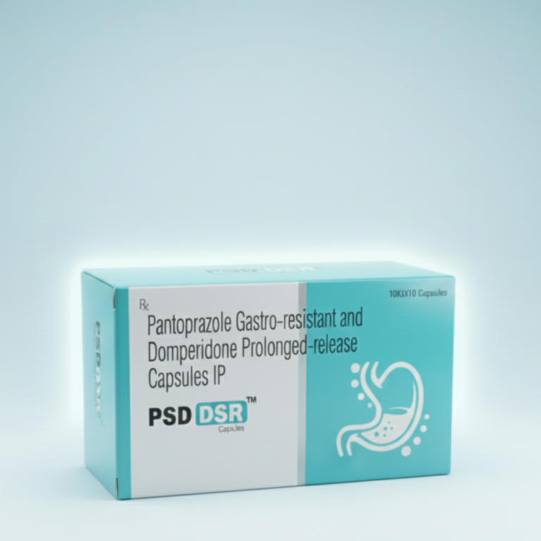 PSD DSR Capsules combine Pantoprazole, a proton pump inhibitor, with Domperidone, a prokinetic agent, to provide comprehensive relief from acid-related gastrointestinal conditions. Pantoprazole works by reducing excess stomach acid production, while Domperidone enhances gastric motility and helps prevent nausea and reflux symptoms.